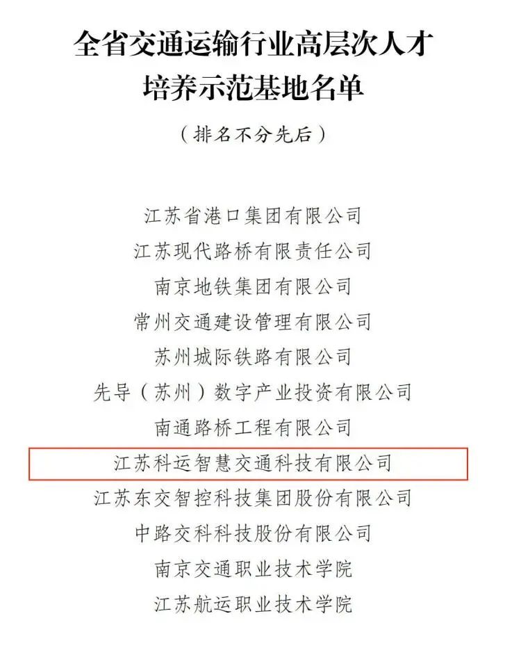 ? ? ??近日,在各單位自主申報(bào)、各設(shè)區(qū)市交通運(yùn)輸局和有關(guān)單位初審?fù)扑]的基礎(chǔ)上,經(jīng)省廳組織復(fù)審,評(píng)選出12家單位為“全省交通運(yùn)輸行業(yè)高層次人才培養(yǎng)示范基地”。其中,集團(tuán)旗下江蘇科運(yùn)智慧交通科技有限公司(以下簡(jiǎn)稱“江蘇科運(yùn)智慧”)成功入選。